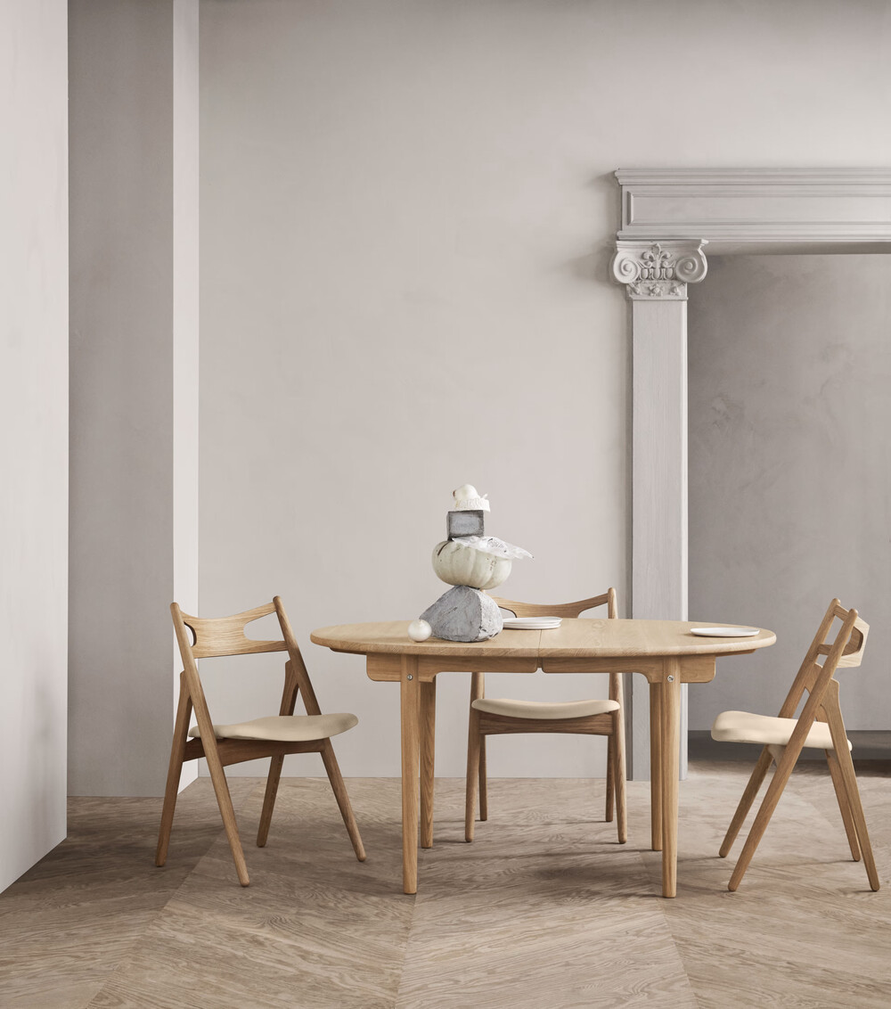 In 1962 Hans J. Wegner designed the smaller dining table CH337 which, in its basic form, is intended for four people. The table is thus, as a starting point, basically suitable for a smaller family, but could easily be extended.