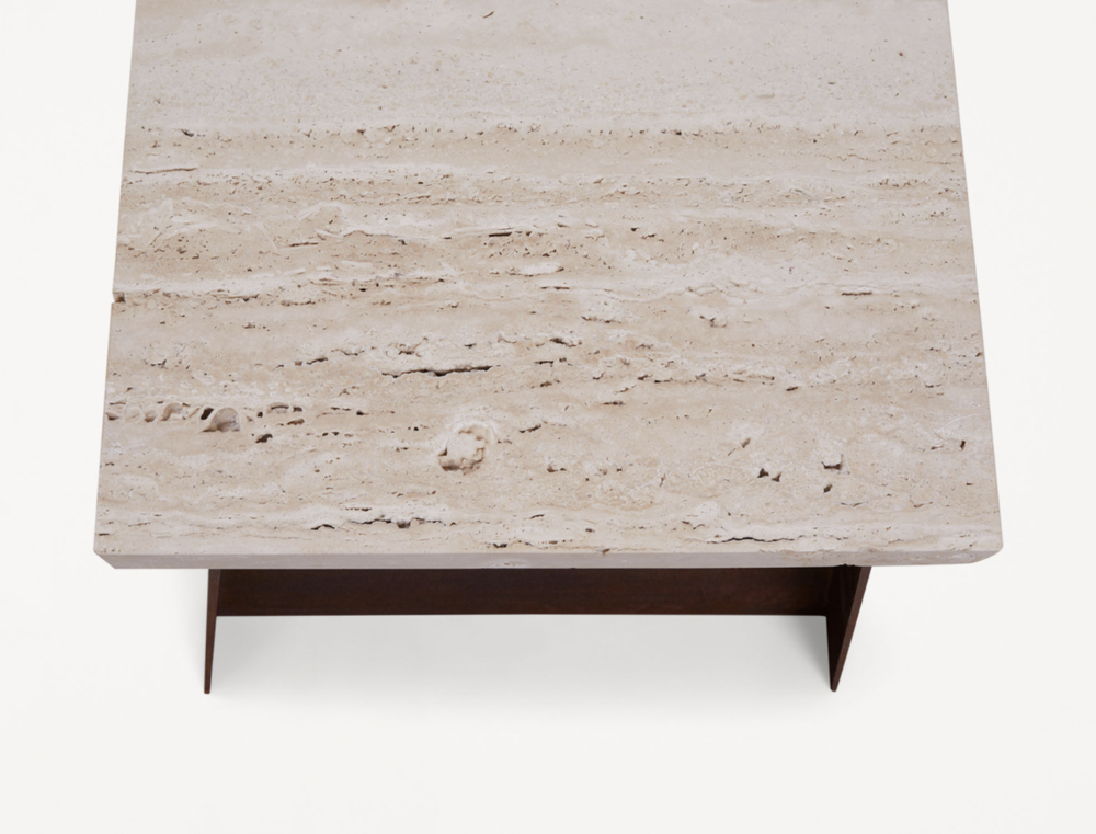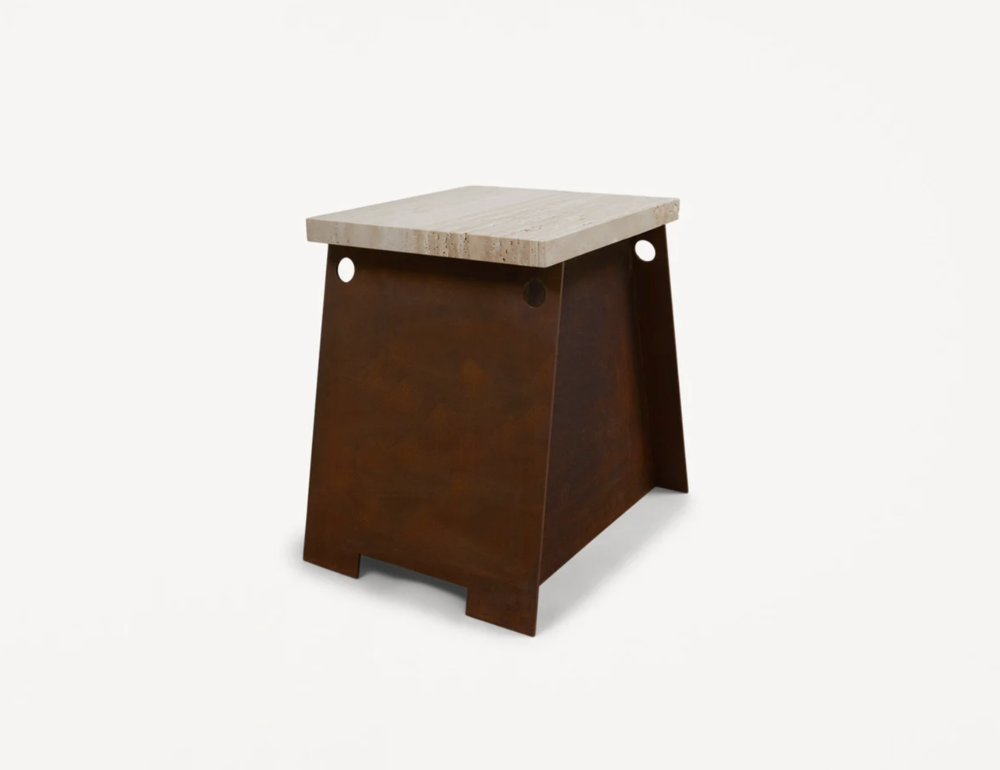 – Travertine top with corten steel base