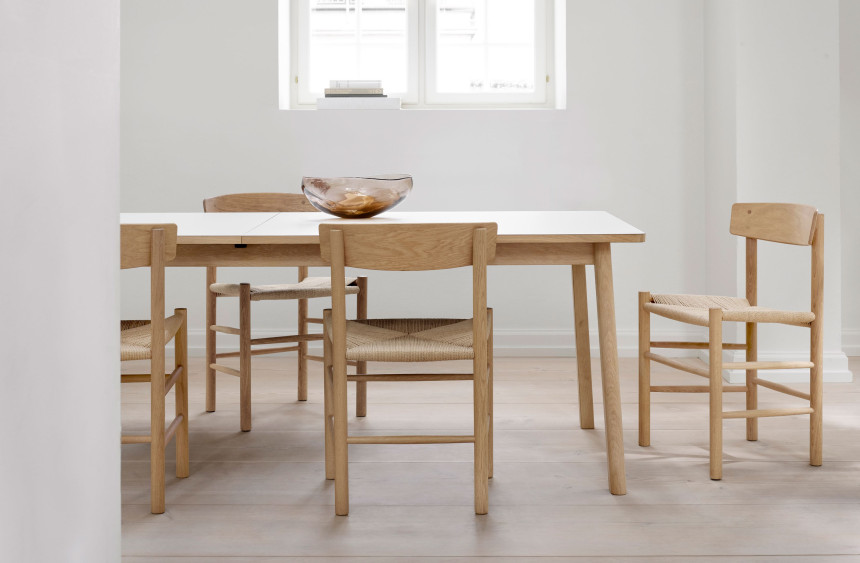 J39 CHAIR by Børge Mogensen in soaped oak with natural paper cord seat ANA TABLE by Arde in oak soap and white nano laminate