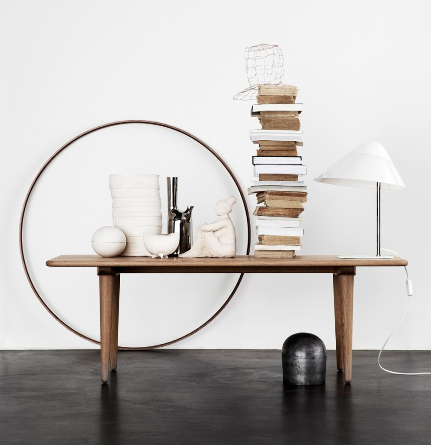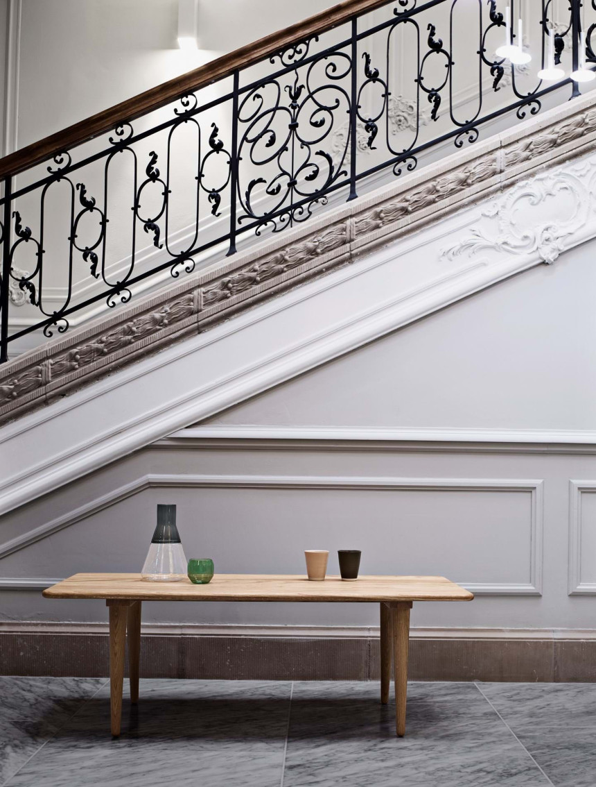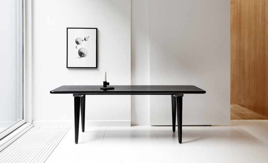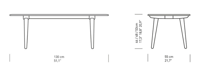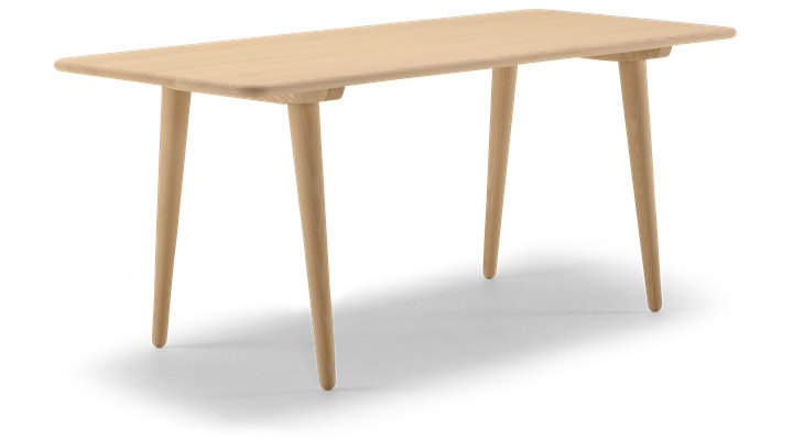 The CH011 coffee table was designed by Hans J. Wegner in 1954. Its four tapered legs tilt slightly outwards towards the two sides of the table, giving the solid top an elegant lightness, which is only further highlighted by the rounding of the legs towards the floor.