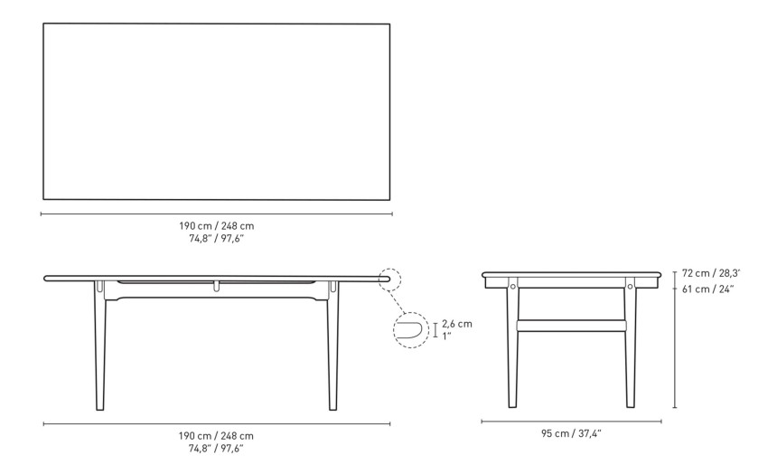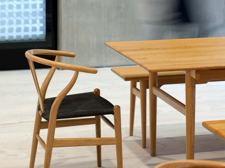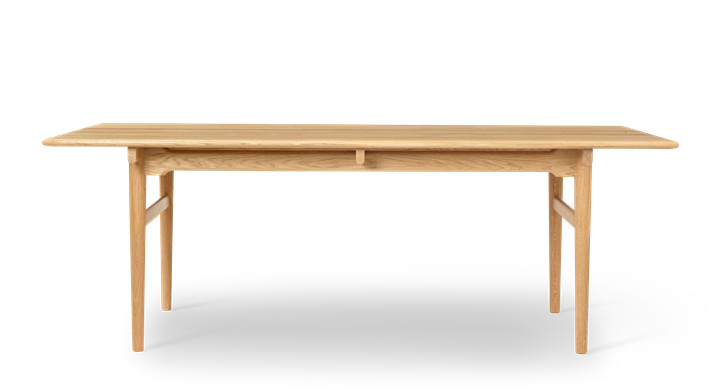 CH327 is a solid wood dining table with softened edges and rounded legs that become narrower towards the floor.