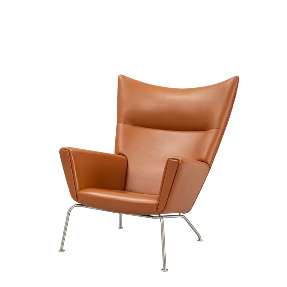 The CH445 Wing Chair is a high-backed, upholstered armchair with a stainless steel frame.