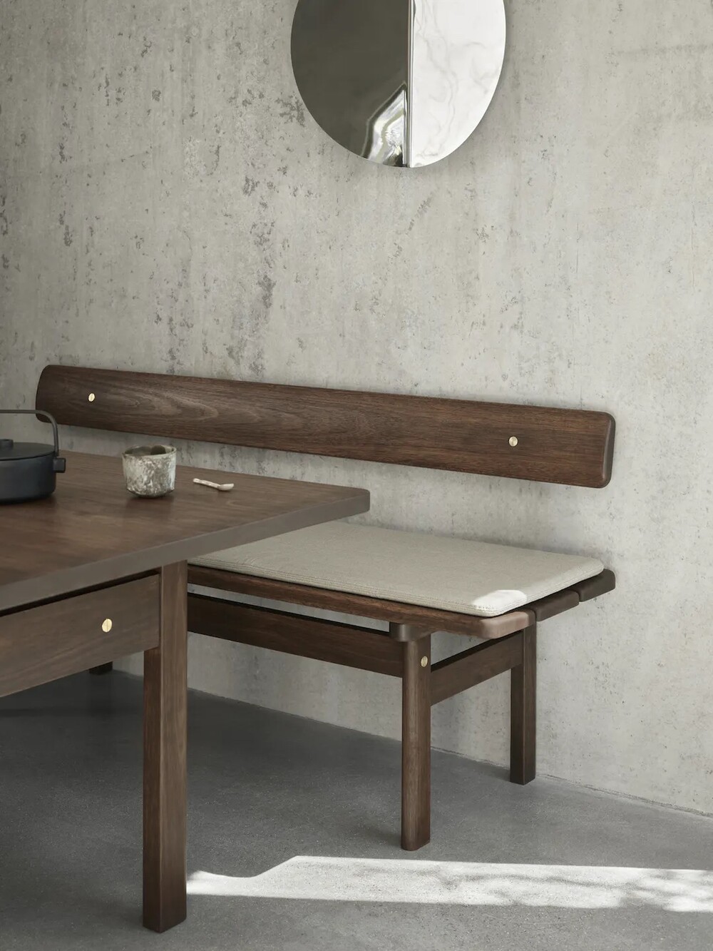 Die Asserbo Bench von Børge Mogensen ist ein hervorragendes Beispiel für ein Design, bei dem der Mensch im Mittelpunkt steht. Es verdeutlicht die Herangehensweise des dänischen Designers an Funktion und Form. Die perfekt proportionierte Sitzfläche aus massivem, dunkel geöltem, FSC™-zertifiziertem Eukalyptusholz hat sanft abgerundete Kanten und sichtbare Schrauben aus gebürstetem Messing. Erhältlich mit einer festen oder einer an der Wand befestigten Rückenlehne sowie mit Kissen aus Leder oder Stoff, wirkt das anpassbare Design warm und einladend.